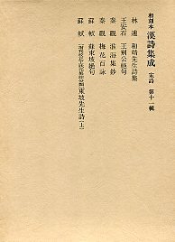 (11)和靖先生詩集 林逋 貞享3年刊。 王荊公絶句 王安石撰 館機點 天保4年刊。 淮海集鈔 秦觀撰 清呉之振編。梅花百詠 秦觀撰 熊谷立閑點。 蘇東坡絶句 蘇軾撰 村瀬修撰。 増刊校正王状元集註分類東坡先生詩 (上) 蘇軾撰 王十朋等注 劉辰翁評 明暦刊。